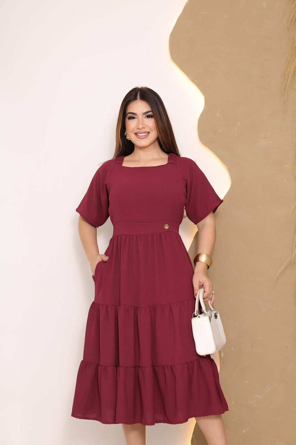 Com decote quadrado e cintura marcada, ele valoriza suas curvas de maneira elegante. As mangas over 3/4 e o delicado lastek nas costas trazem um toque de charme e feminilidade. O barrado de Marias adiciona um detalhe especial, enquanto o forro na parte da saia proporciona conforto e liberdade de movimento.